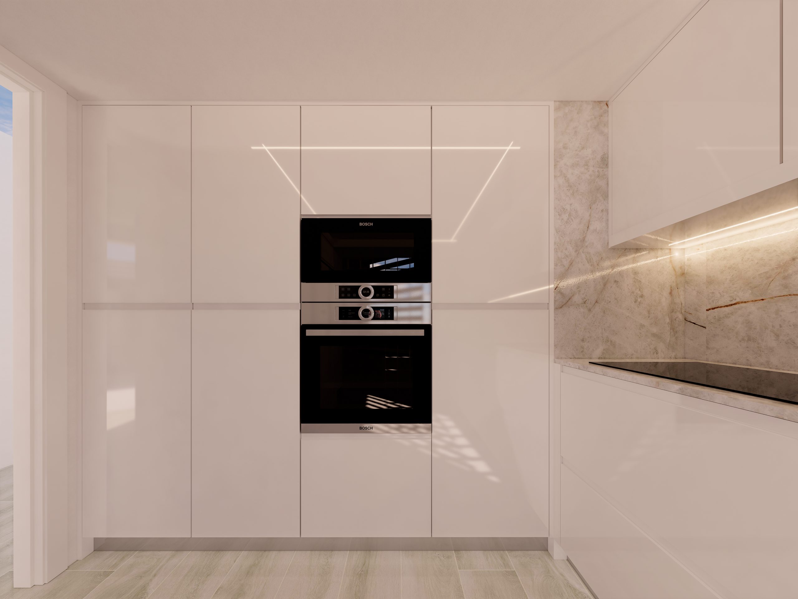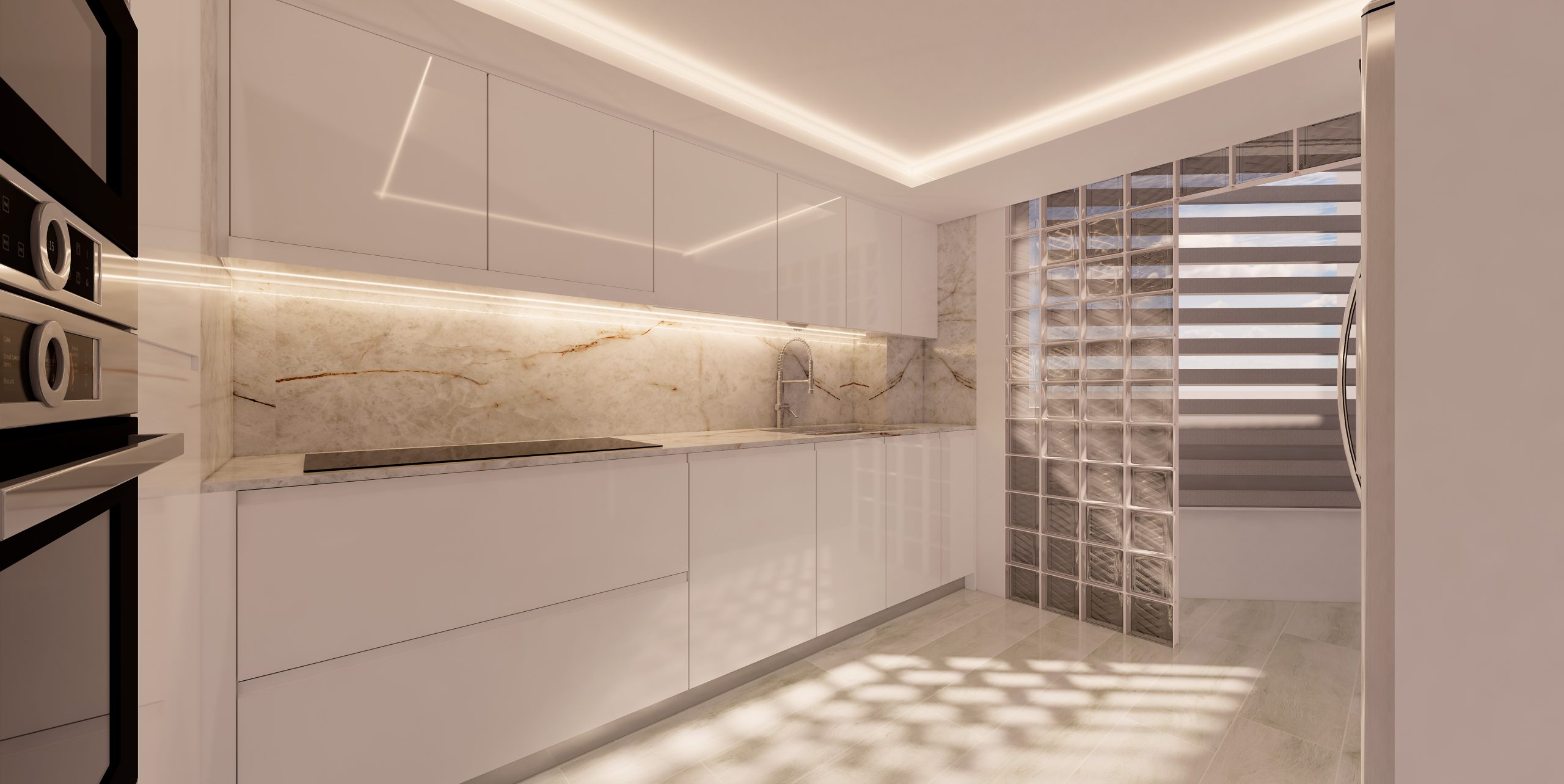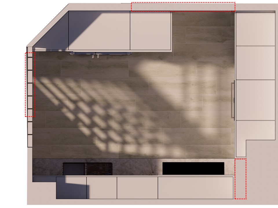 • El actual azulejo se sustituye por paredes lisas, en el frente y lateral de zona principal se reviste del mismo material que la encimera.