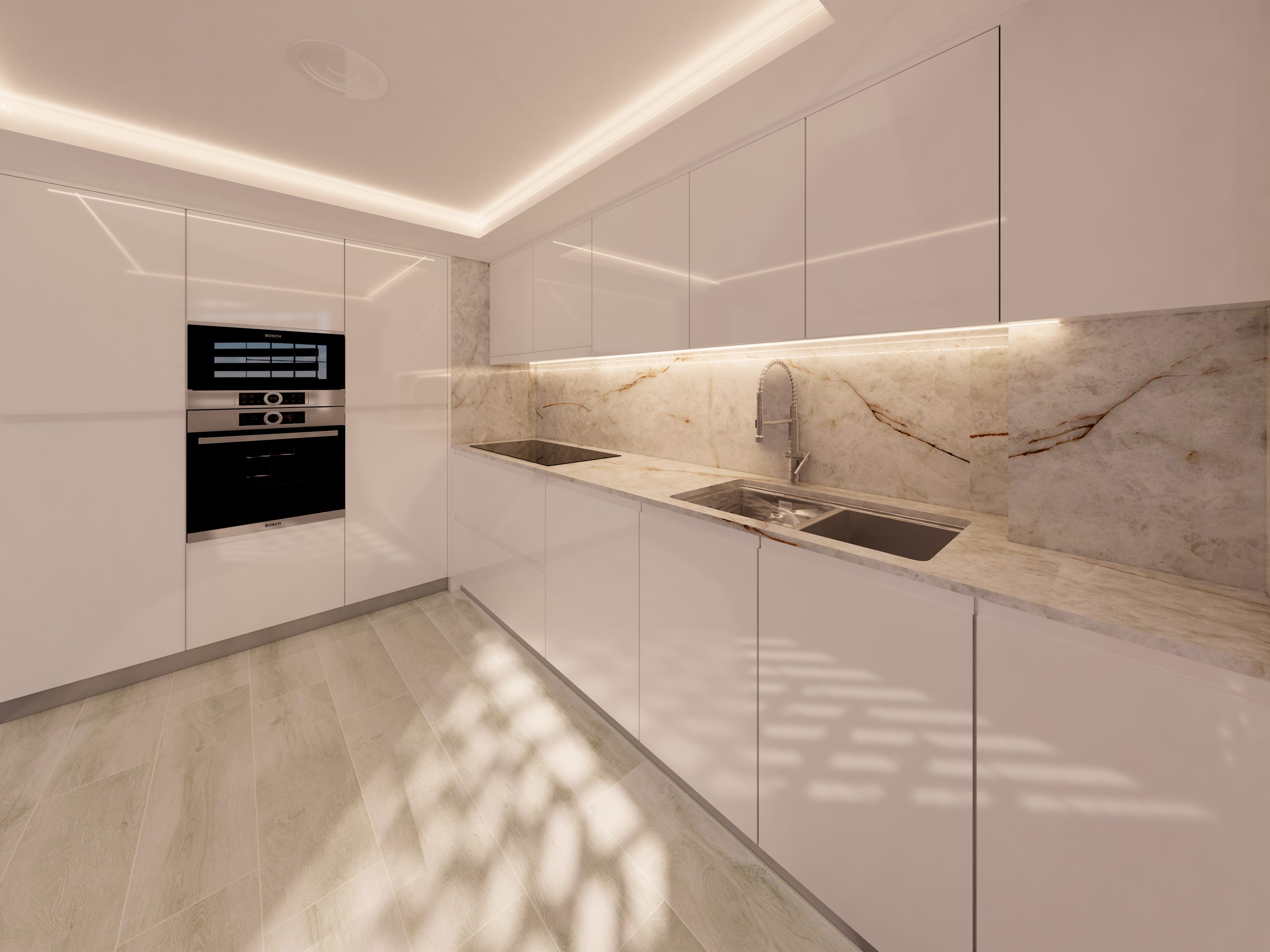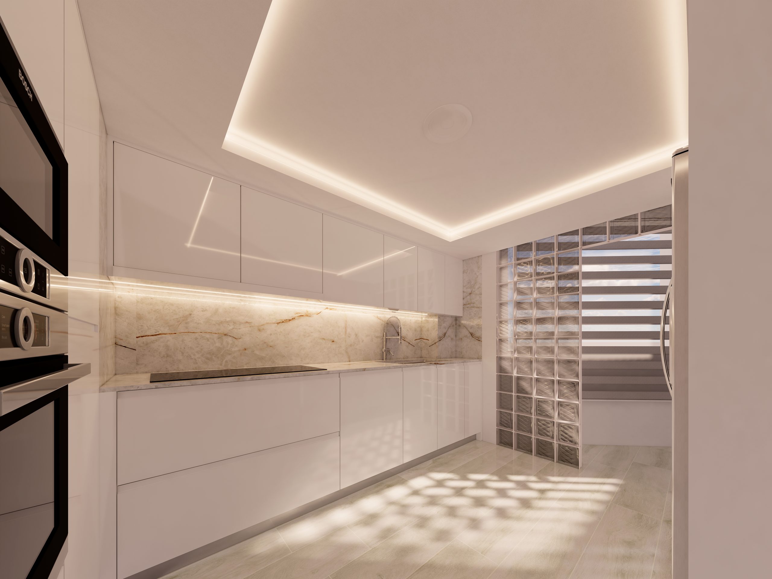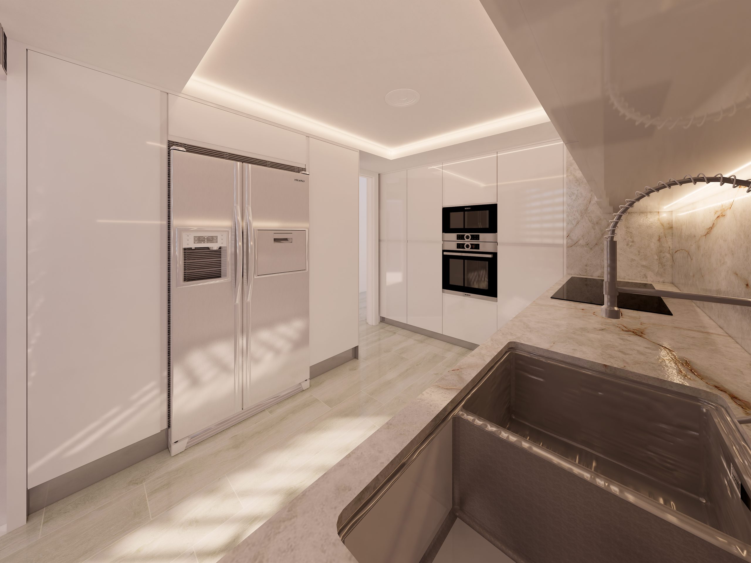 • El actual azulejo se sustituye por paredes lisas, en el frente y lateral de zona principal se reviste del mismo material que la encimera.
