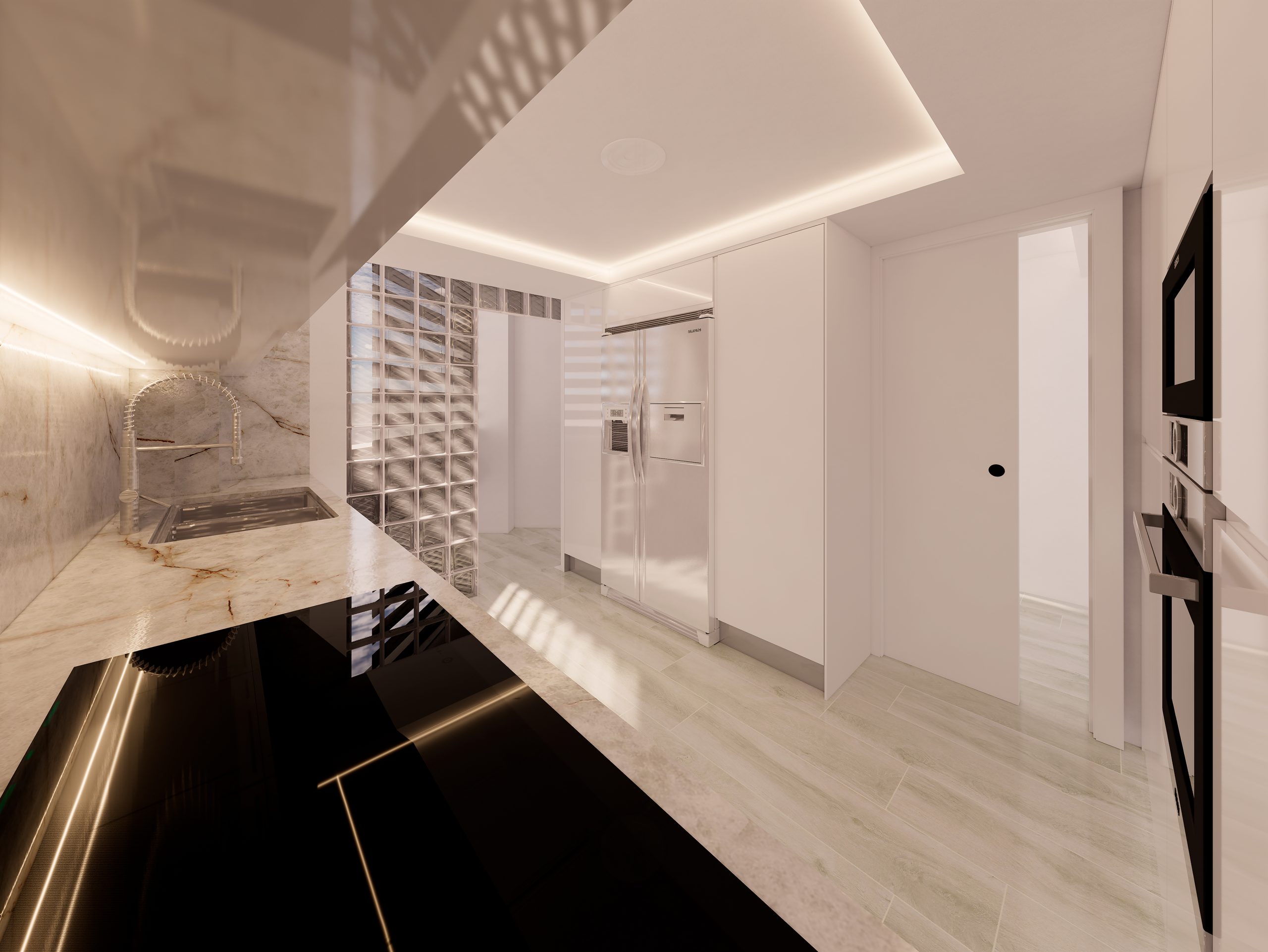 • La actual puerta de acceso a la cocina la sustituimos por una puerta corredera.